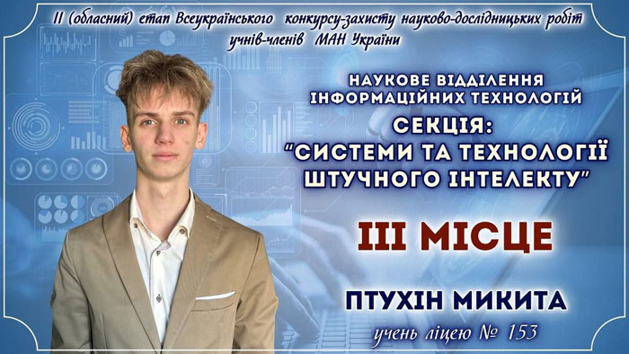 Кафедра інформаційних комп’ютерних технологій і математики вітає призера та його наукових керівників – Галину САЖКО, кандидата педагогічних наук, доцента кафедри ІКТМ та Аліну ЧАЙКУ – випускницю кафедри, нині учителя інформатики КЗ «Харківського ліцею № 153 Харківської міської ради», із вагомим результатом. На ІІ (обласному) етапі Всеукраїнського конкурсу-захисту науково-дослідницьких робіт учнів-членів МАН України у науковому відділенні «Інформаційні технології» секція «Системи та технології штучного інтелекту» здобув ІІІ місце учень комунального закладу «Харківський ліцей № 153 Харківської міської ради» Микита ПТУХІН. Читати далі