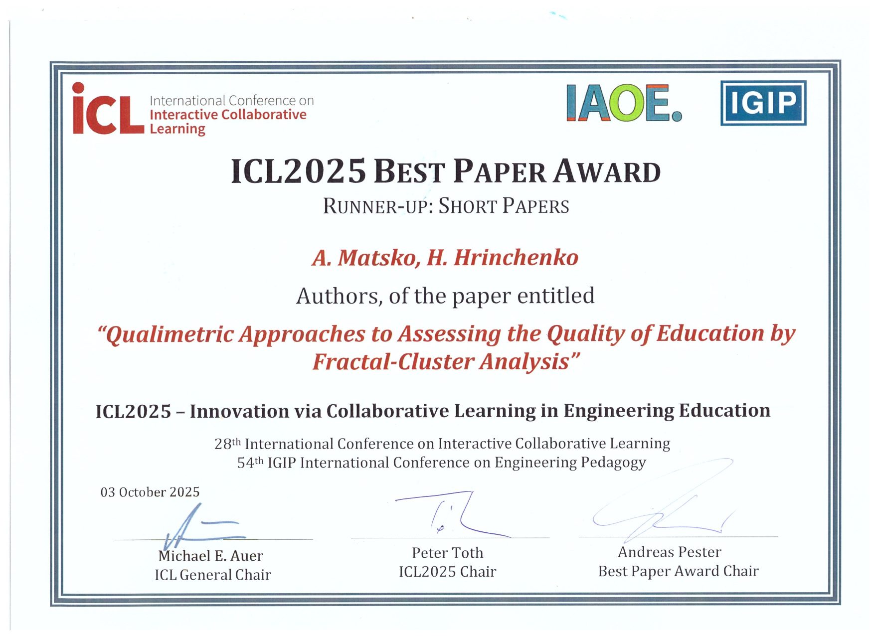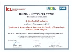 Також стаття авторів Ганни Грінченко та Андрія Мацько «Кваліметричні підходи до оцінки якості освіти за допомогою фрактально-кластерного аналізу» отримала відзнаку як краща стаття конференції у номінації коротких статей.
